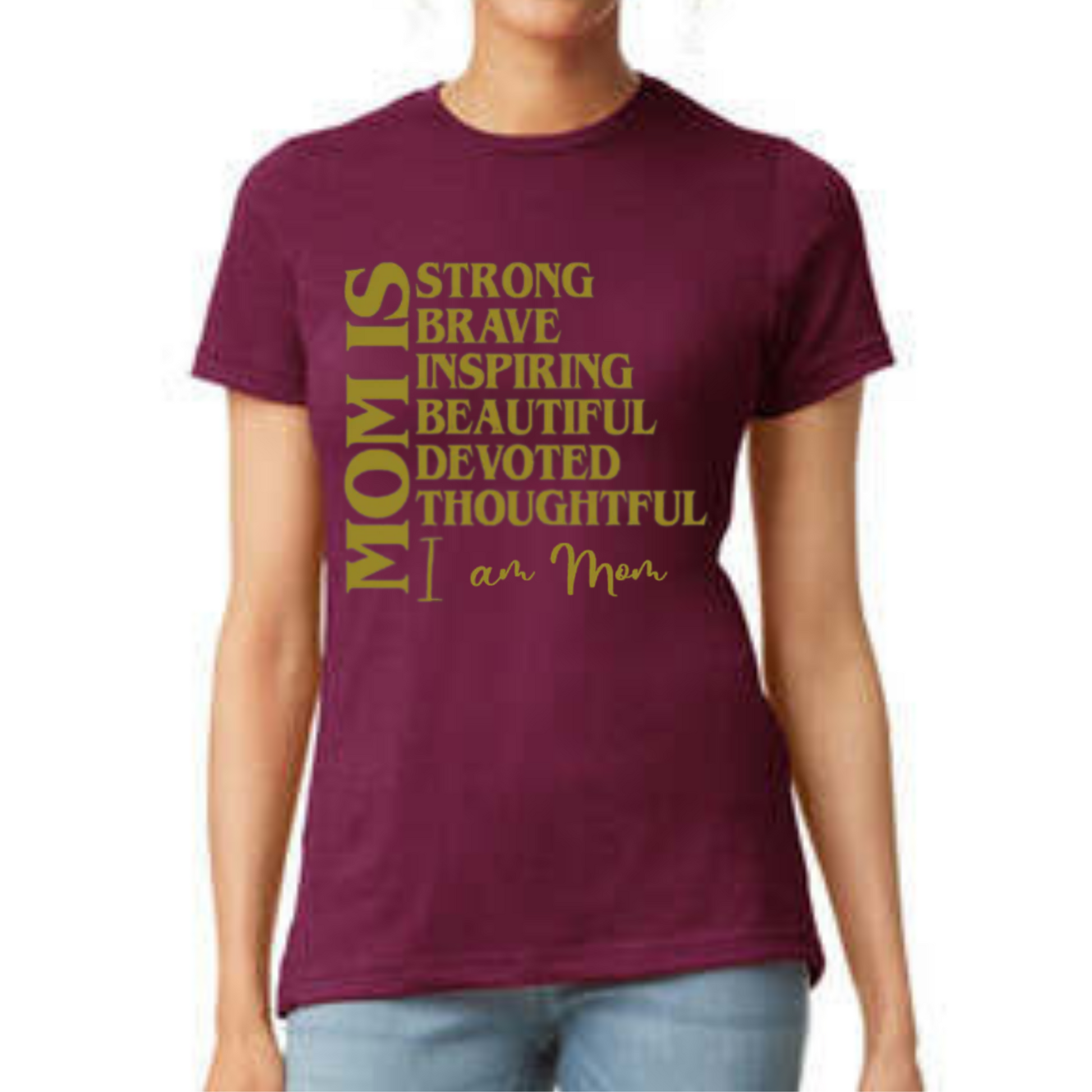 Honor the strength and beauty of motherhood with this inspirational T-shirt featuring a bold vertical and horizontal text design that celebrates everything moms are — strong, brave, inspiring, beautiful, devoted, and thoughtful.The uplifting message ends with the heartfelt phrase “I am Mom,” making this shirt a perfect tribute to every mother’s love and resilience.